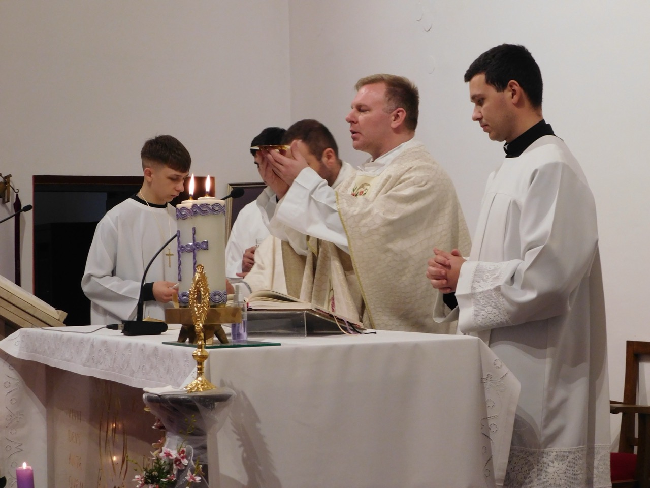 Velečasni Danijel Hačko, župnik u zagrebačkim Sesvetama, predslavio je prijepodnevnu sv. Misu. Uz njega je slavio vlč. Krunoslav Kolar, župnik na zagrebačkoj Kajzerici. Prisutni su bili i bogoslovi Fabijan Križanović i Mihael Popić, kao i ministranti Matej Kenfelja i Luka Balaško.